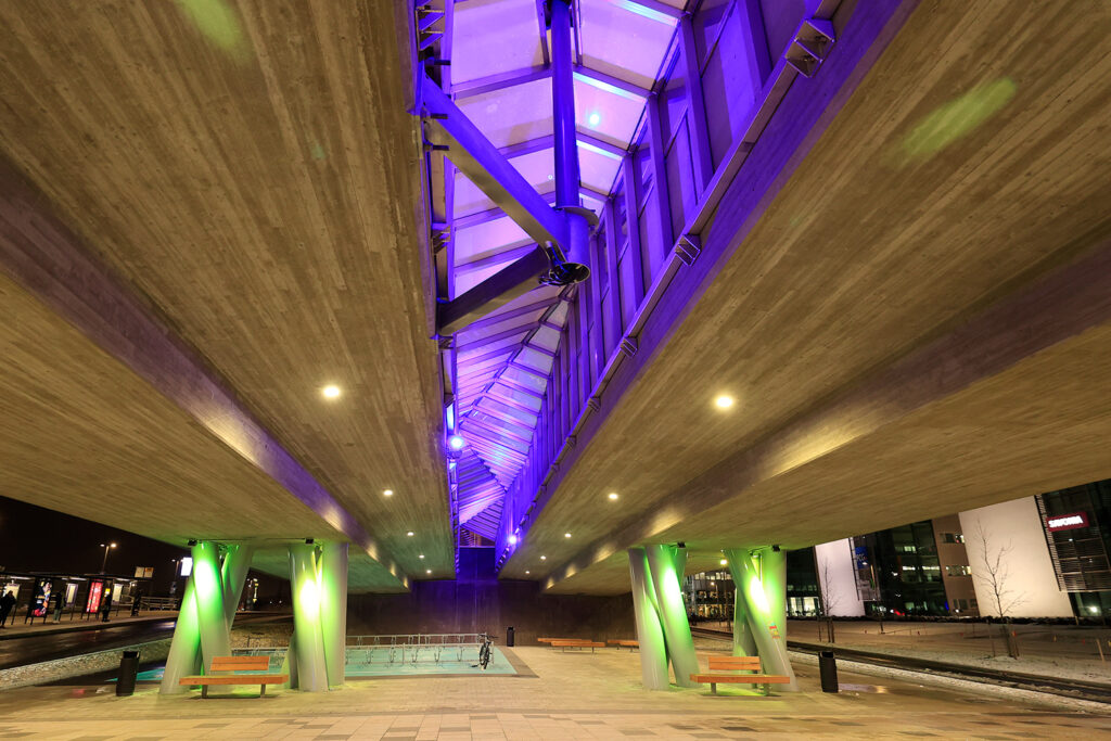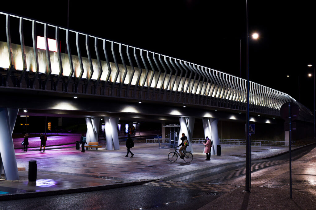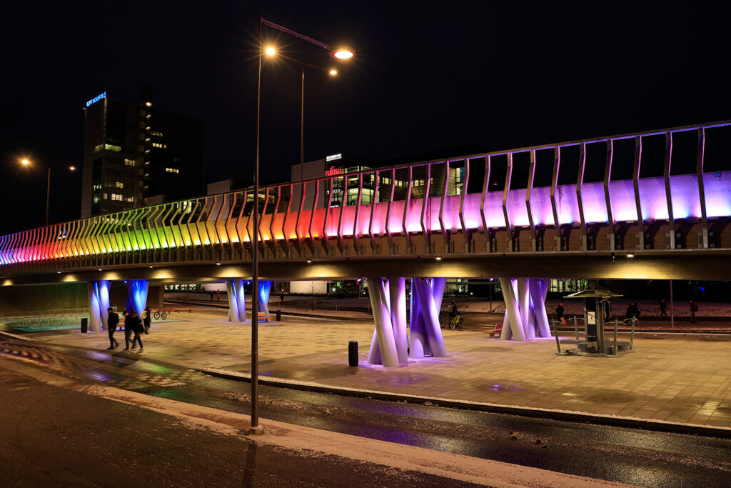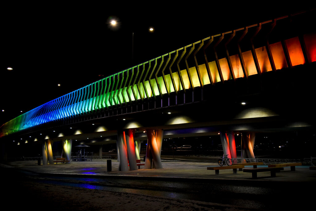 Sillan valot loistavat sateenkaarenväreissä pimeässä.